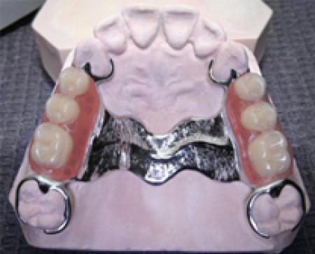 Самый простой и дешевый бюгельный протез. Имеет несколько пружинистых кламмеров (крючков), которыми он "цепляется" за зубы.