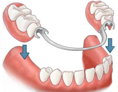 Самый простой шаг к восстановлению зубов (и, соответственно, самый дешевый) -  бюгельный протез на кламмерах. Он имеет несколько пружинистых кламмеров (крючков), которыми он "цепляется" за зубы. Такие бюгельные протезы зубов выполняют требования по функциональной части - пережевыванию пищи, но эстетические качества оставляют желать лучшего: при разговоре и улыбке Ваш собеседник не сможет не заметить металлических "крючков" на зубах на Ваших зубах. Также, при постоянном снятии и одевании протеза "крючки" травмируют зубную эмаль, зубы становятся чувствительными. Нарушается и гигиена полости рта, так как частички пищи задерживаются кламмерами.