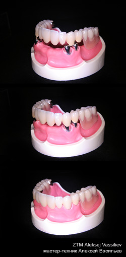 Коронки фиксируются на зубах на постоянный цемент и являются несъемной частью комбинированного протеза.