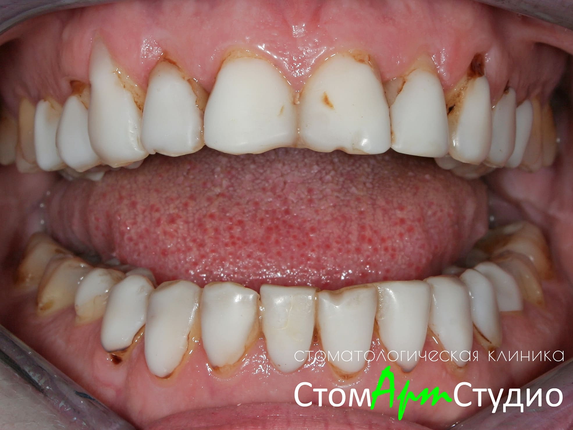 Зубы в зоне улыбки в неудовлетворительном состоянии. Пациент стесняется улыбаться.