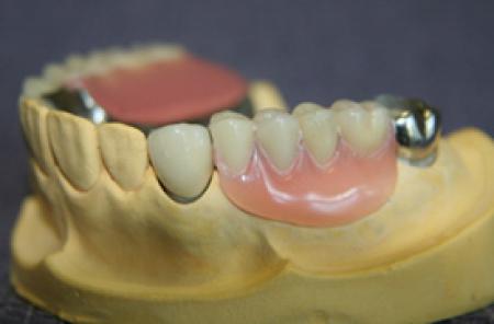 Самый простой шаг к восстановлению зубов (и, соответственно, самый дешевый) - бюгельный протез на кламмерах. Он имеет несколько пружинистых кламмеров (крючков), которыми он "цепляется" за зубы. Такие бюгельные протезы зубов выполняют требования по функциональной части - пережевыванию пищи, но эстетические качества оставляют желать лучшего: при разговоре и улыбке Ваш собеседник не сможет не заметить металлических "крючков" на зубах на Ваших зубах. Также, при постоянном снятии и одевании протеза "крючки" травмируют зубную эмаль, зубы становятся чувствительными. Нарушается и гигиена полости рта, так как частички пищи задерживаются кламмерами.