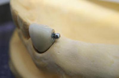 Такой аттачмент состоит из двух частей: металлического шарика (патрица), который прикреплен к коронке, и ответной пластмассовой части (матрица), которая фиксируется в протезе.