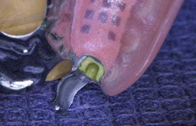 В момент одевания протеза пластмассовая матрица обхватывает металлический шарик на коронке. Таким образом бюгельные протезы зубов "защелкиваются" и надежно удерживаются на своем месте.