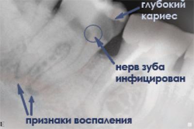Если кариес остается незамеченным, скрывается под пломбой или не лечится долго по причине того, что пациент думает "а, как-нибудь потом... Само пройдет... Сейчас не до этого...", то инфекция проникает глубоко в ткани зуба, попадает в канал и инфицирует его нерв. Возникает воспаление нерва - пульпит.