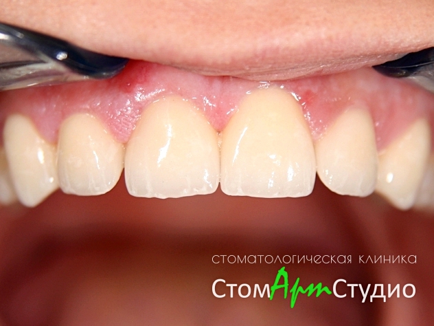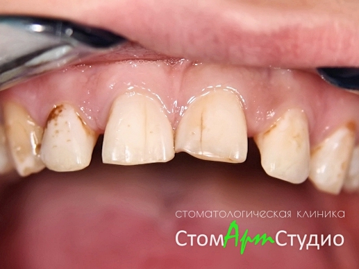 В зоне улыбки пациента на зубах темные пятна, щели, сколы.
