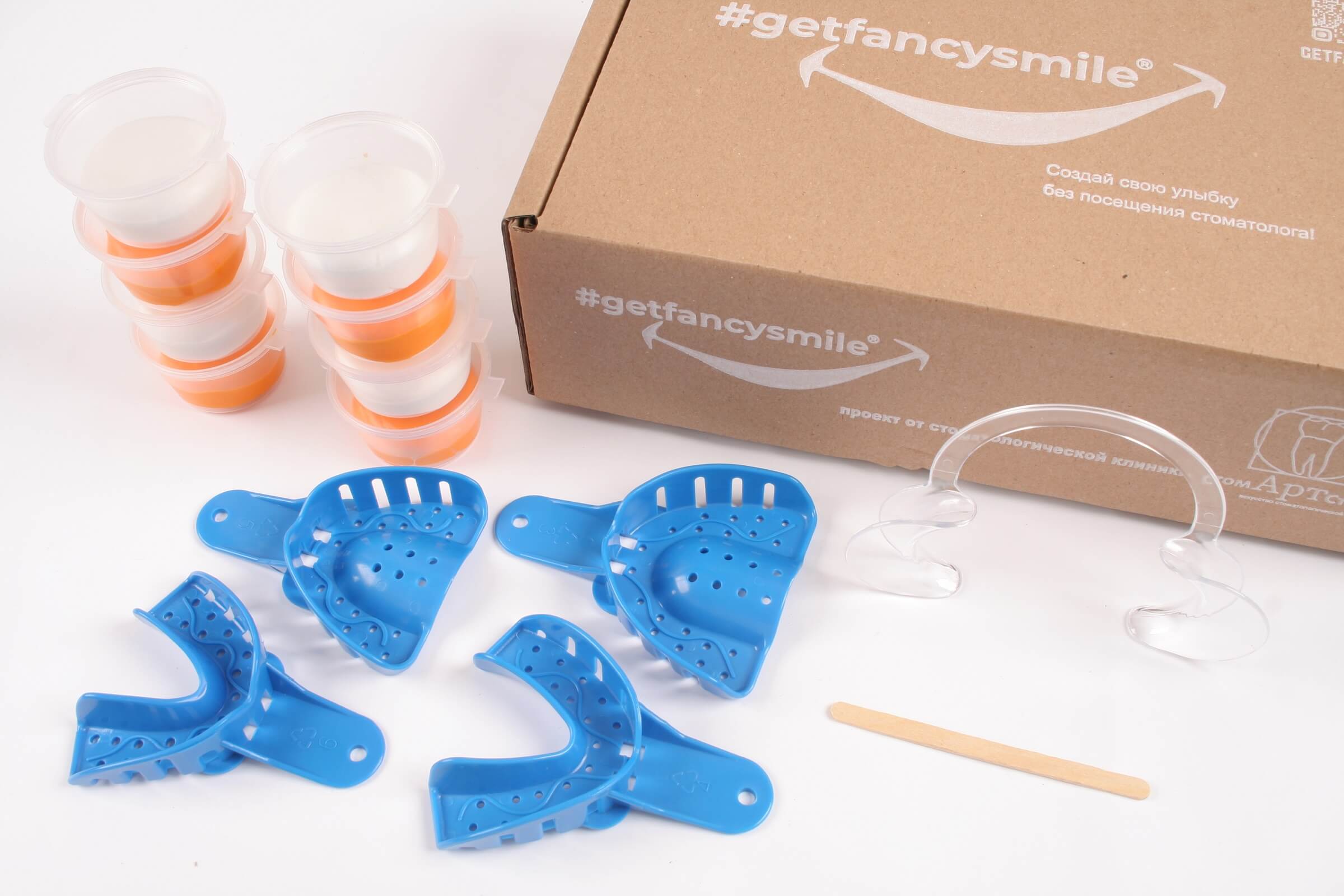 Все очень просто! Нам нужен лишь слепок Ваших зубов, который Вы легко сможете сделать сами в домашних условиях. Для этого мы разработали Стартовый набор, в котором есть все необходимое. Его бесплатно привезет Вам курьерская служба в любую точку России.